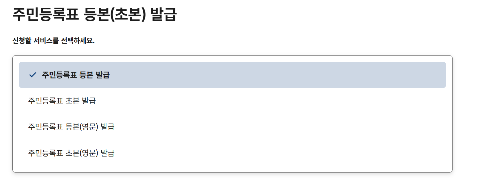 본인의 주민등록상 주소지를 선택후, 하단의 발급하기 버튼을 클릭하면 끝입니다. 정말 간단하죠? 같은 방식으로 초본, 영문버전도 동일하게 발급받을 수 있습니다.