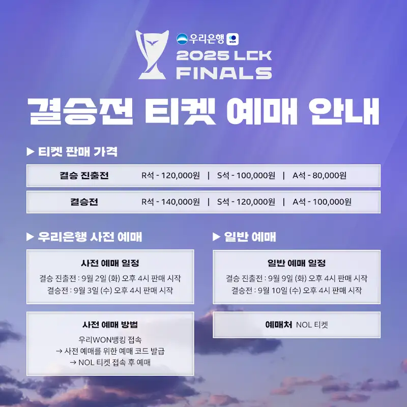 A. 아직 정확한 예매 오픈 일정은 발표되지 않았습니다. 예매 공지는 LCK 공식 SNS와 인터파크 티켓에서 확인 가능합니다.