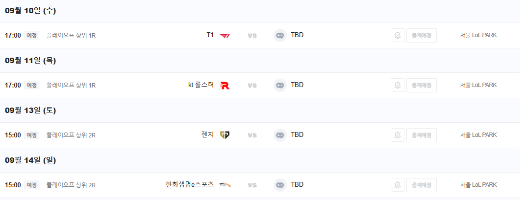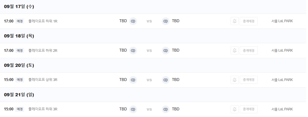 - 플레이오프 : 9월 5일 ~ 21일 (LoL Park)