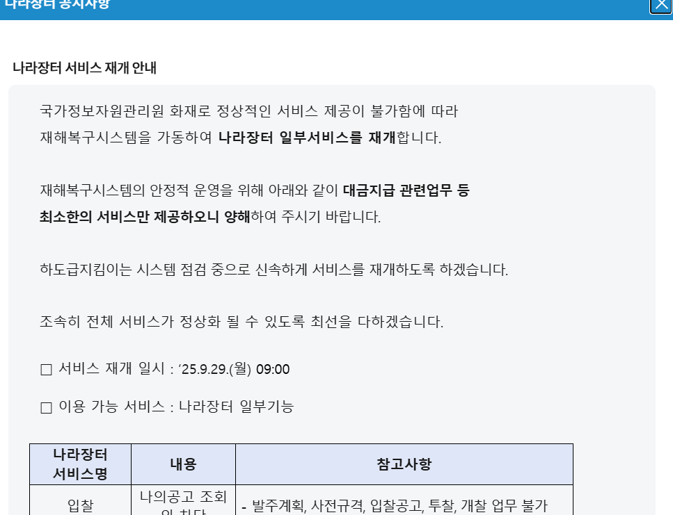 복구되는 서비스 목록은 포털/부처 공지를 통해 수시 업데이트 됩니다. 본문 상단의 업데이트 시각을 함께 확인하세요.