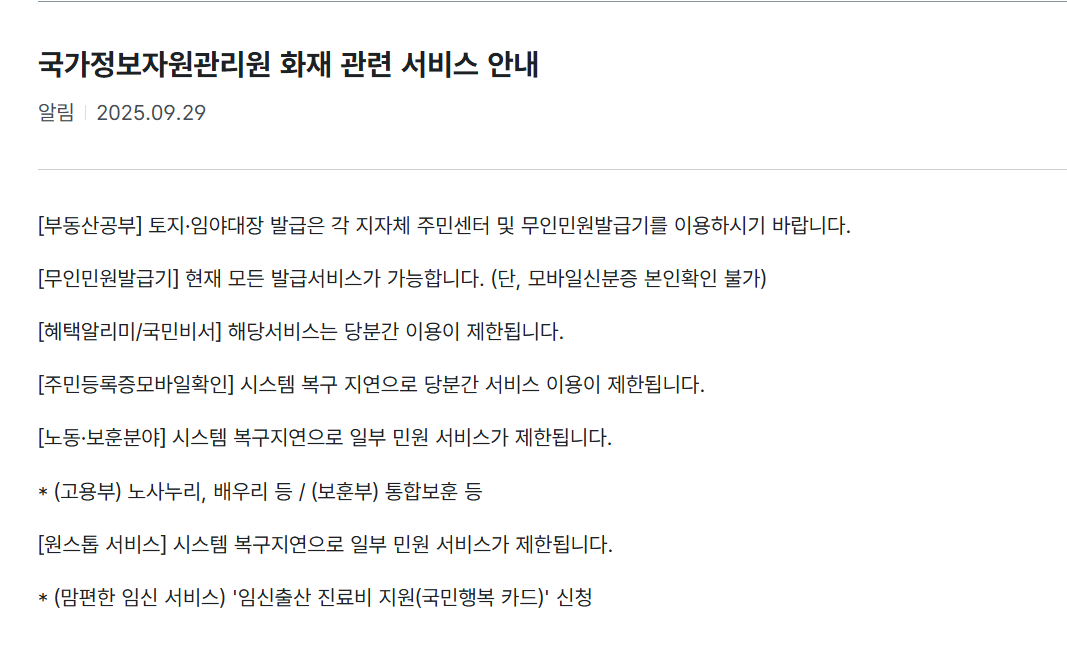 9월 26일 국가정보자원관리원(국정자원) 대전 본원 전산실에서 화재가 발생해 다수의 행정·복지·우편·보건 시스템이 중단되었습니다. 정부는 중대본 체제로 전환해 우선순위에 따라 단계적 복구를 진행하고 있습니다.