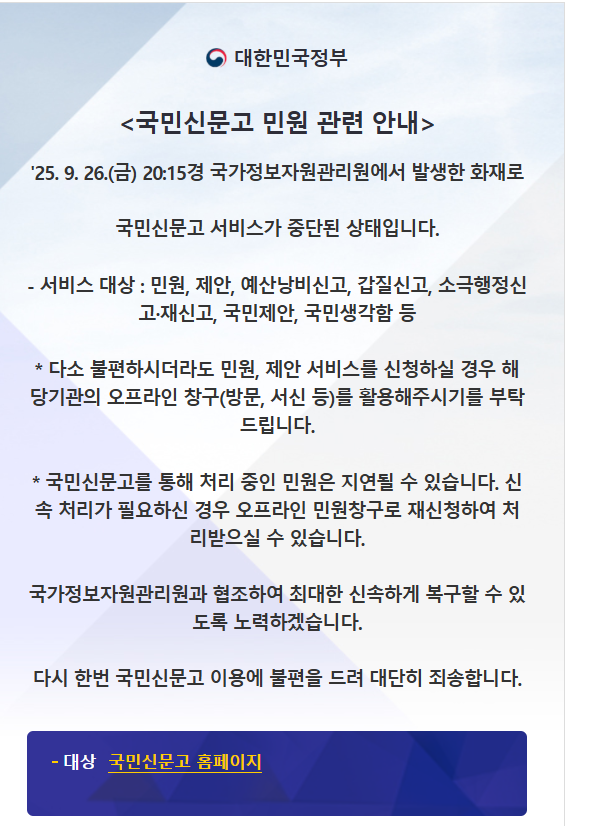 이번 글은 국정자원 화재로 인한 민원 시스템 오류의 전모를 정리합니다. 복구 현황과 함께 화재 원인, 예상 정상화 시간, 대응 요령까지 한 번에 확인하세요.