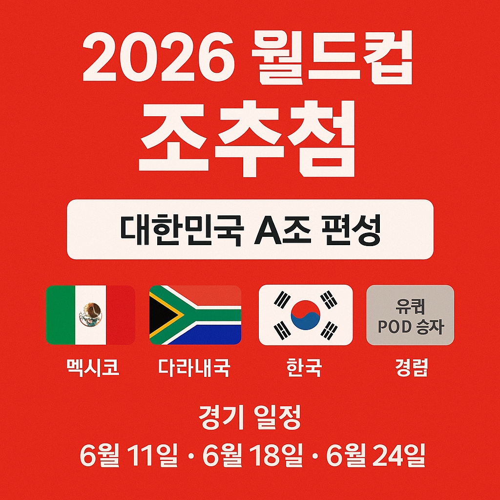 2026 월드컵 조추첨 결과, 한국은 멕시코·남아프리카공화국·유럽 플레이오프 D 승자와 함께 A조에 편성되면서 만만치 않지만 충분히 도전해볼 수 있는 조 구성을 받았습니다. 2026 월드컵 한국 경기 일정은 모두 멕시코에서 열리며, 한국시간 기준으로는 주로 오전 시간대 경기가 될 가능성이 큽니다.