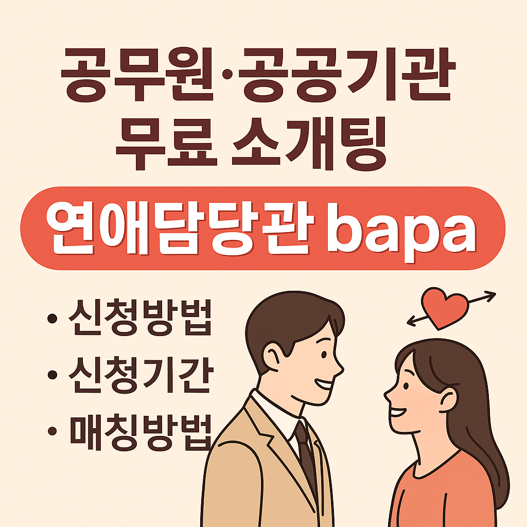 지금까지 공무원·공공기관 무료 소개팅 서비스 ‘연애담당관 bapa’의 신청방법, 신청기간, 공식사이트 이용법, 매칭방법까지 핵심 내용을 정리해 보았습니다. 야근과 민원에 치여 연애가 늘 뒷순위로 밀려났다면, 이런 공무원 무료 소개팅 서비스도 하나의 선택지가 될 수 있습니다. 지금까지 공무원·공공기관 무료 소개팅 연애담당관 bapa 신청방법, 신청기간, 매칭방법에 대해 알아보았습니다.